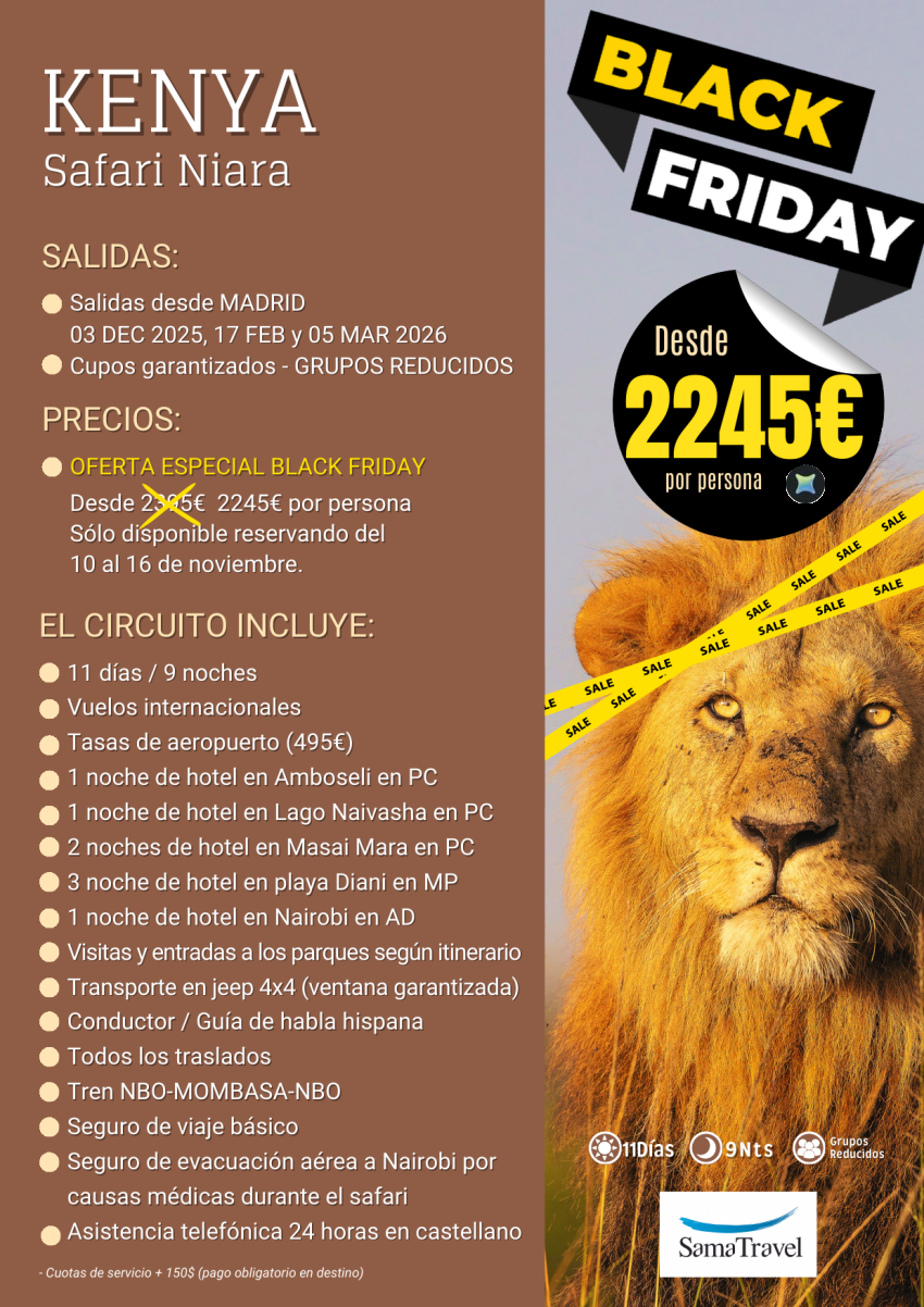 Black Friday: Kenya Safari Niara+Playa: 150€ de DESCUENTO!! circuito 11 días sólo reservas del 10 al 16 nov
